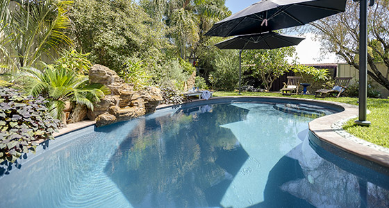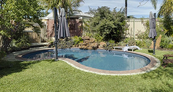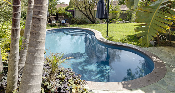 This traditional kidney shaped pool is a popular choice. The smooth curves of this design flow onto the extended second step, which provides generous seating space.